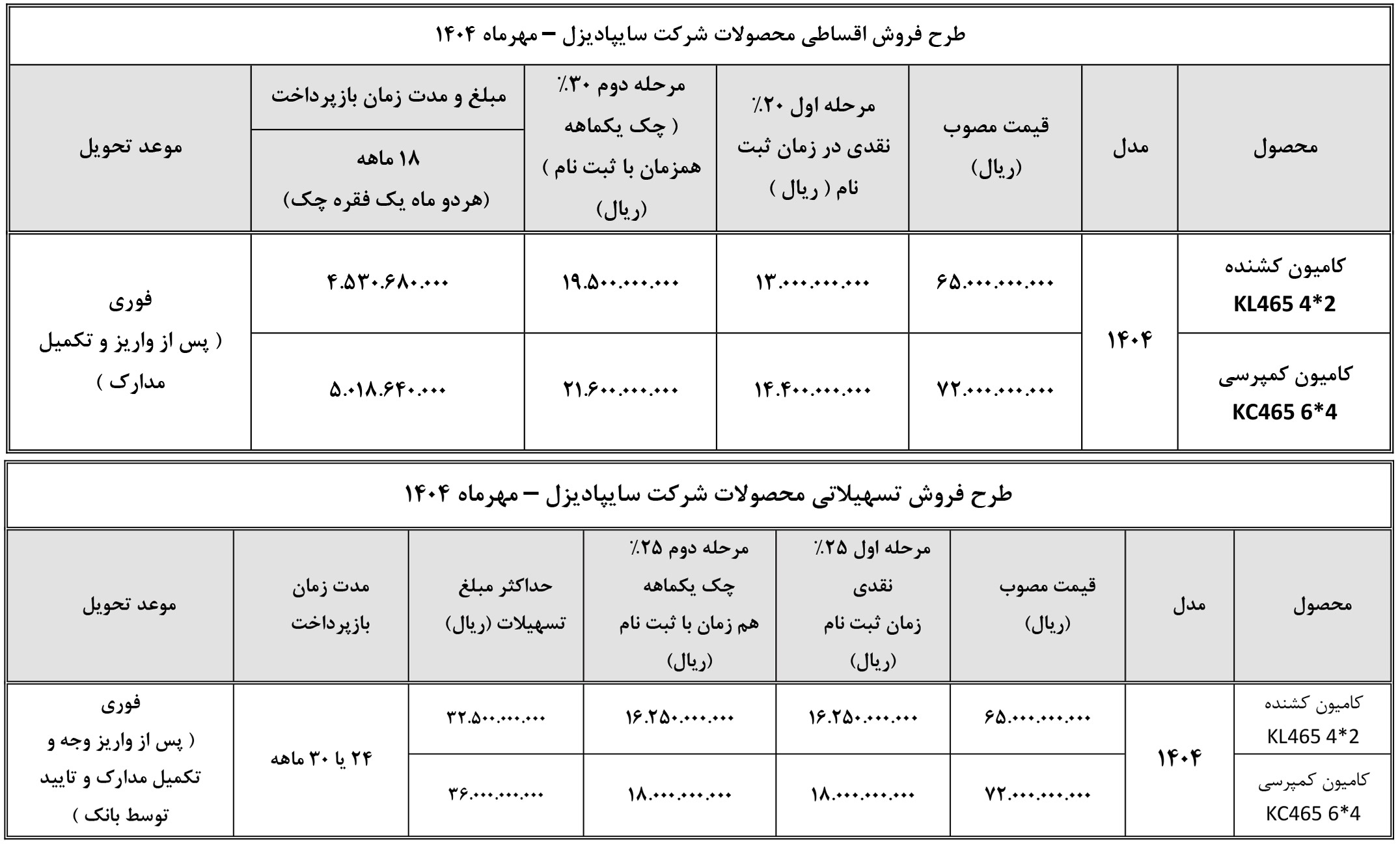 فروش نقدی و اقساطی کامیون سایپا: مهر 1404