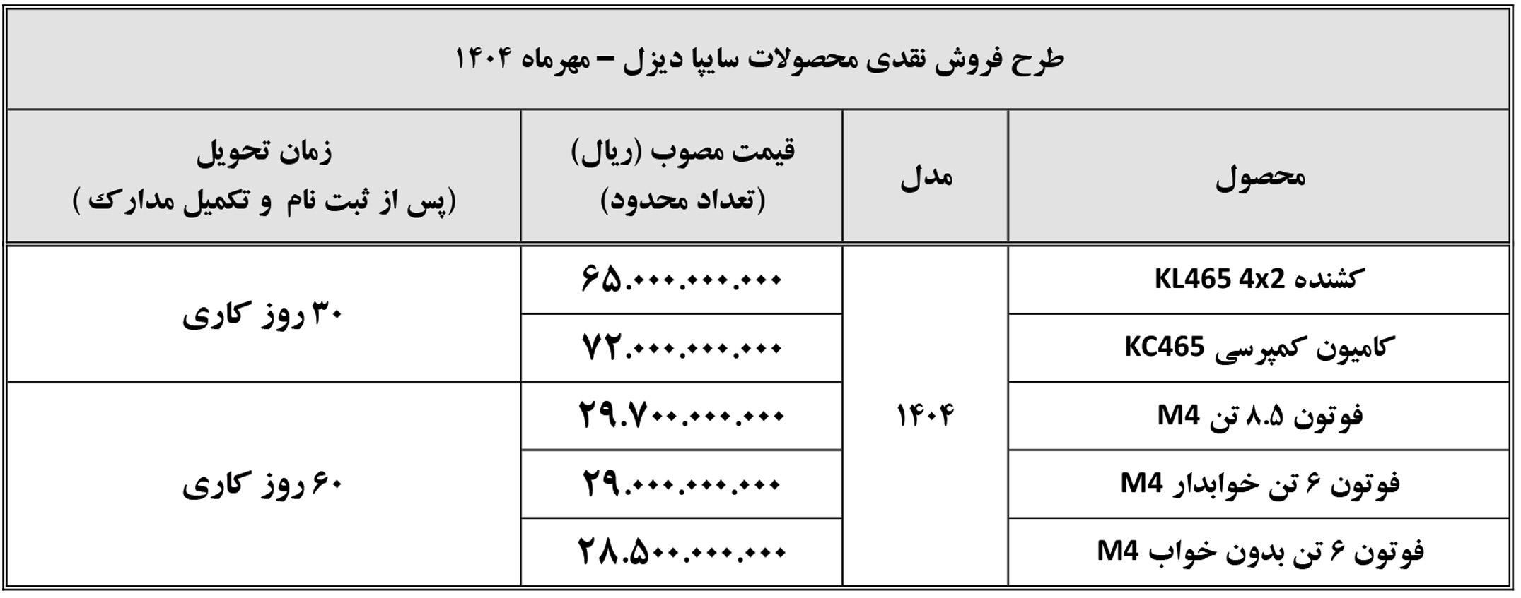 از روز یکشنبه مورخ 1404/07/13 فروش سایپا دیزل ویژه متقاضیان ثبت نام کامیونت فوتون و کامیون کشنده دانگفنگ، مطابق جداول زیر آغاز میشود: