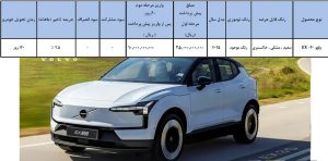 احتراماً با عنایت به اطلاعیه شهریورماه سال ۱۴۰۴ سامانه عرضه خودرو های برقی (اتو نوین) خودروی VOLVO EX-30 به اطلاع متقاضیان حائز شرایط خرید خودرو میرساند امکان واریز وجه برای منتخبین پس از ارسال پیامک بهصورت فروش نقدی مرحلهای با قیمت علیالحساب (غیرقطعی) فراهم است.