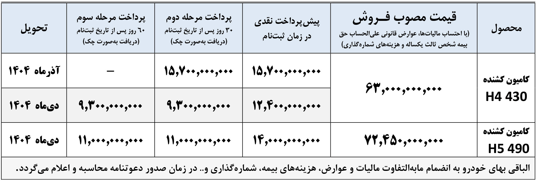 ثبت نام کامیونت آرنا پلاس در قالب طرح فروش اقساطی، از ساعت 10 صبح روز چهارشنبه مورخ 1404/07/16 آغاز شده و تا زمان تکمیل ظرفیت فروش نیز ادامه دارد: