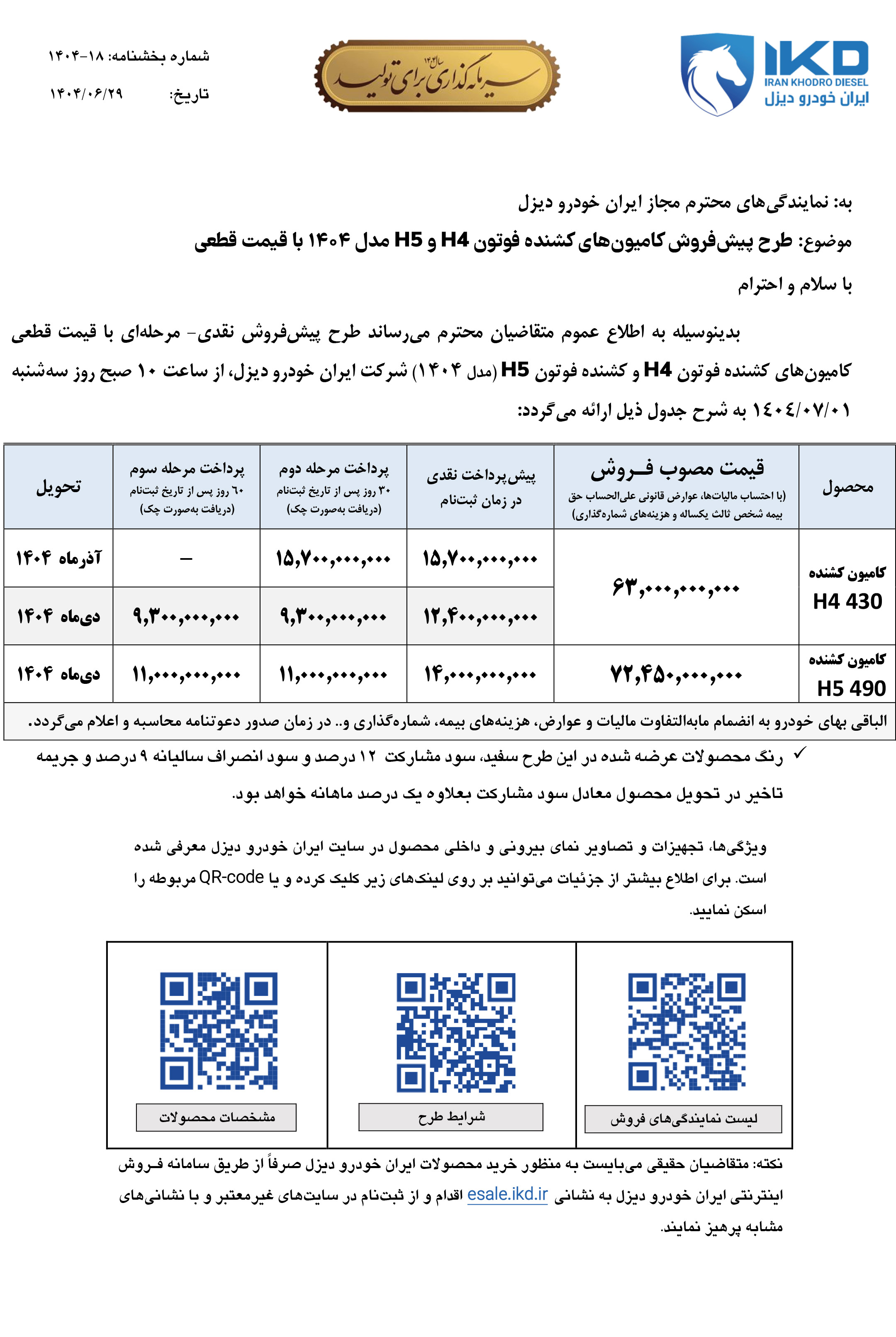 طرح فروش اینترنتی کامیون کشنده H4 و H5 شرکت ایران خودرو دیزل، از ساعت 10 صبح سهشنبه مورخ 1404/07/01 آغاز شده و تا زمان تکمیل ظرفیت فروش نیز ادامه خواهد داشت: