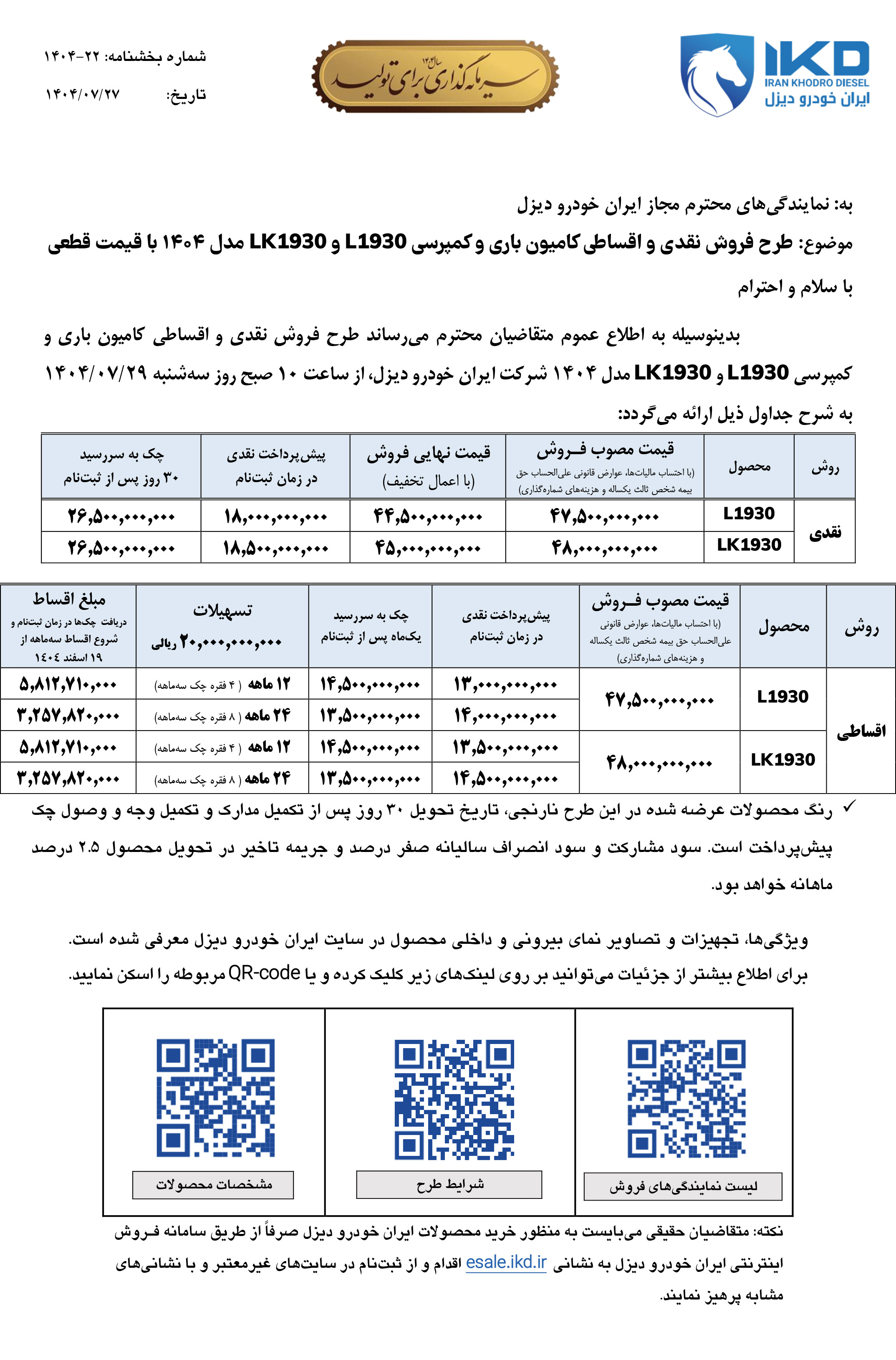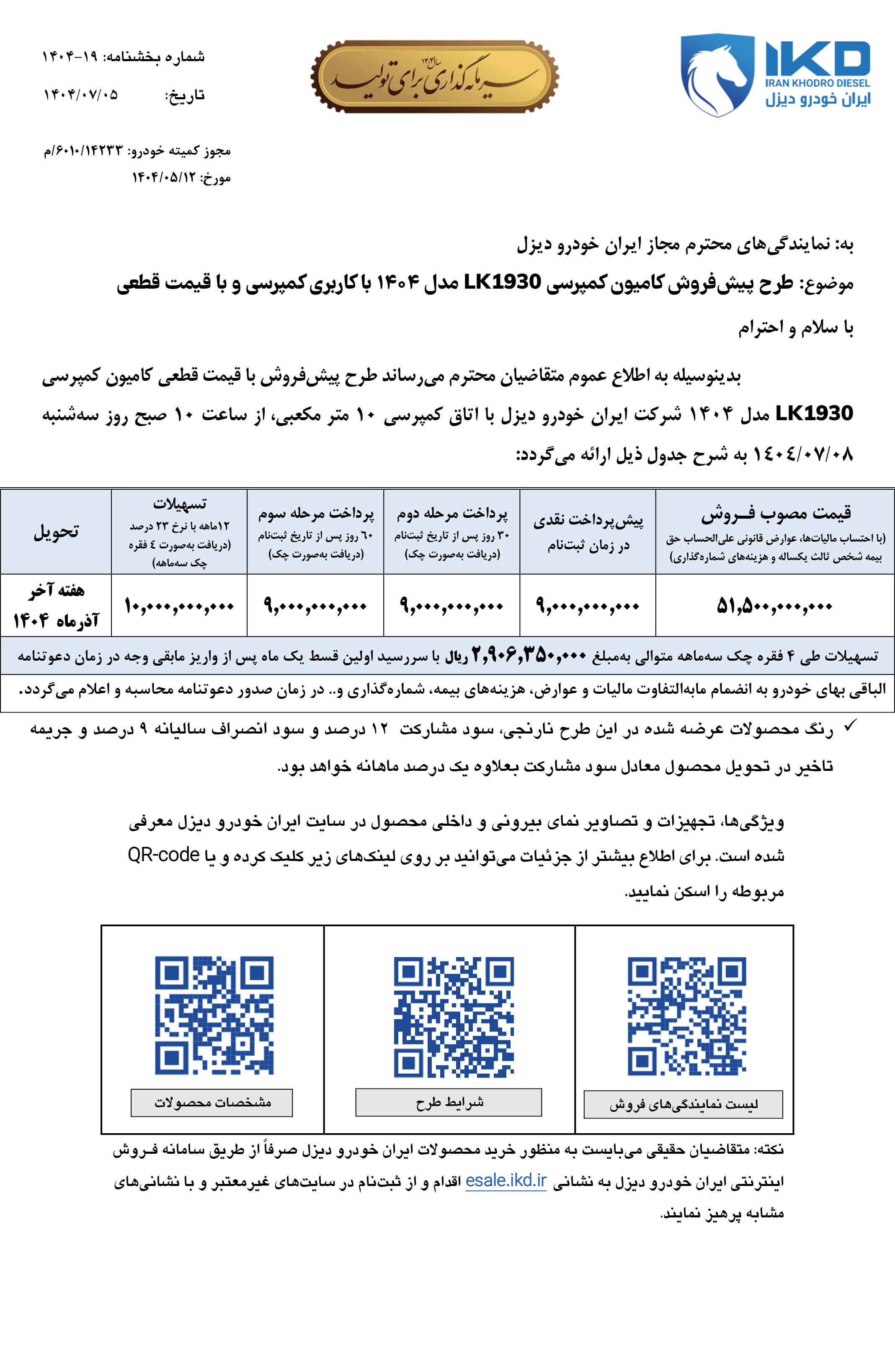 از ساعت 10 صبح سهشنبه مورخ 29 مهرماه 1404، فروش کامیون واگن هود 1930 در مدلهای باری و کمپرسی، آغاز میشود. متقاضیان این مرحله از فروش کامیون ایران خودرو دیزل، علاوه بر طرح فروش نقدی، میتوانند طرح فروش اقساطی را نیز انتخاب نمایند: